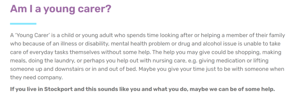 If you personally know a young person aged 6-25 in Stockport who you think may be a young carer and needs some help, you’re welcome to contact Sign Post for Carers on 0161 442 0442 or via email info@signpostforcarers.org.uk. All enquiries will be treated with the utmost confidentiality. You can find out more about referrals using the link below. You are also welcome to contact school regarding this and to keep us informed so we can best support any Young Carers in school. We regularly host assemblies from Sign Post to keep the children informed of who young carers are and how they can be supported.