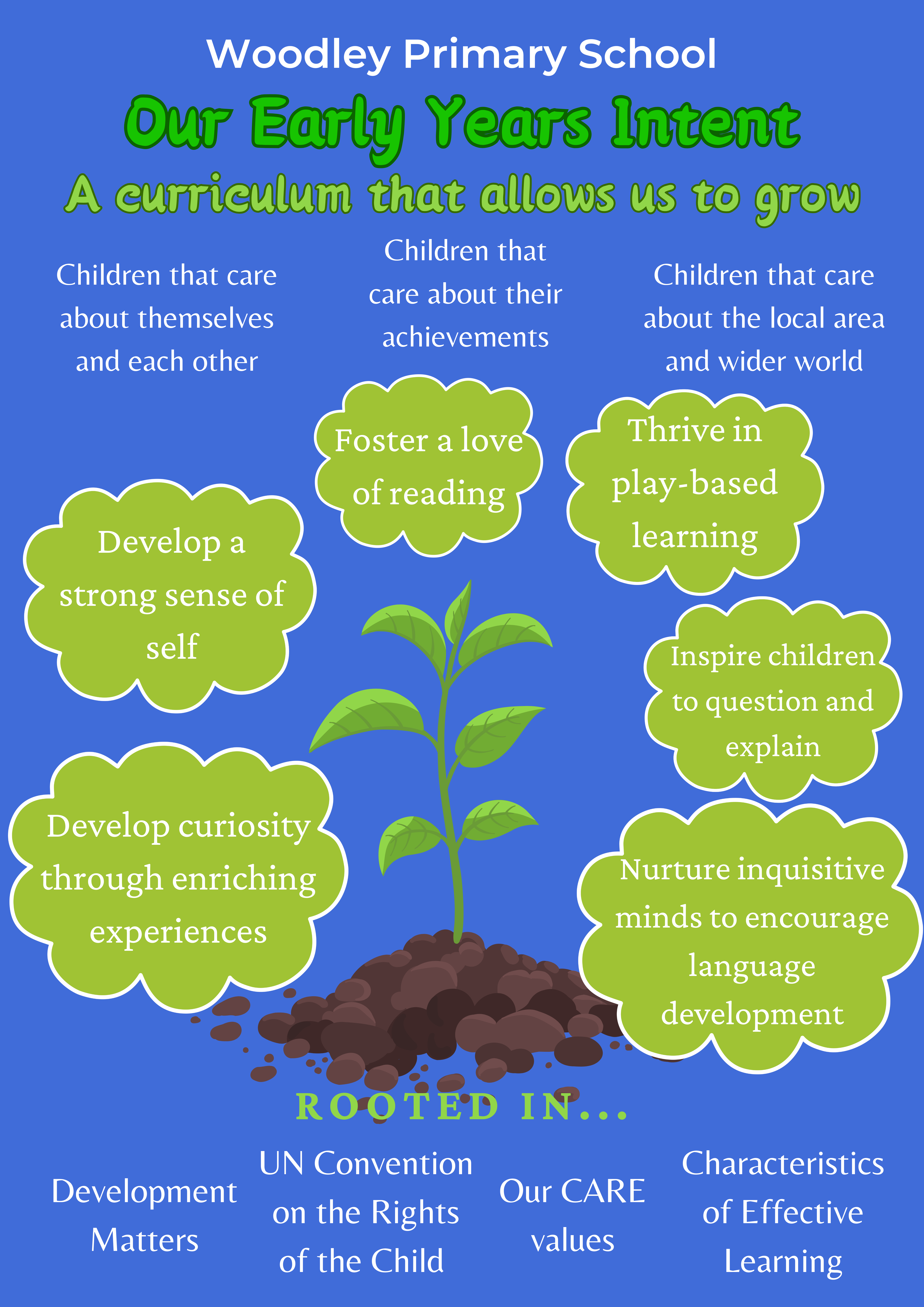 At Woodley Primary School, our Early Years Foundation Stage (EYFS) includes both Nursery and Reception classes. Our curriculum in this foundational phase is thoughtfully designed, drawing inspiration from Development Matters, the Characteristics of Effective Learning, our CARE values, and the UN Convention on the Rights of the Child.